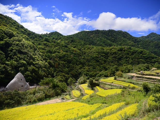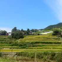 海岸線から内陸に向かって山間を進み、しばらく走ると視界が広がり、急斜面一杯に広がる一面の棚田風景を見ることができます。